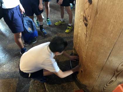 有名な柱の穴をくぐっています。