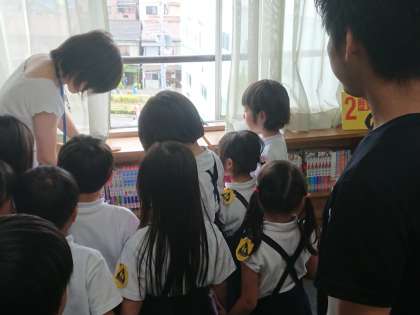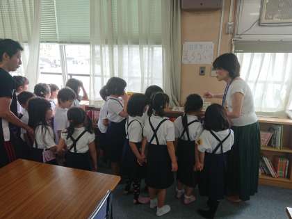 1年生が図書室で図書館補助員の先生から本の説明を受けています。