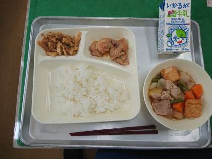 今日の給食は、鶏肉のてり焼き、じゃがいもとあつあげの煮もの、ごまかかいため、ごはん、牛乳です。