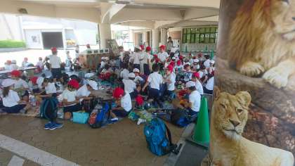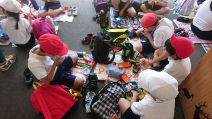教頭先生が守り抜いた日陰で、子どもたちはおいしいお弁当を食べてます。
