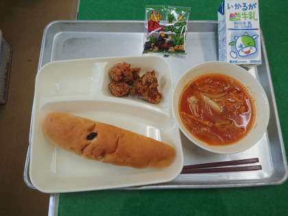 今日の給食は、一口トンカツ、ミネストローネ、豆こんぶ、レーズンパン、牛乳です。
