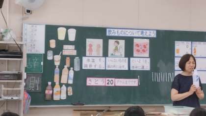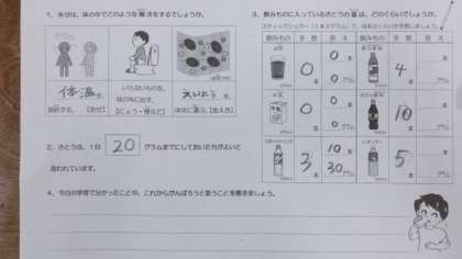 体の中の水分の役割や、飲み物に含まれる砂糖の量などについて学習しました。