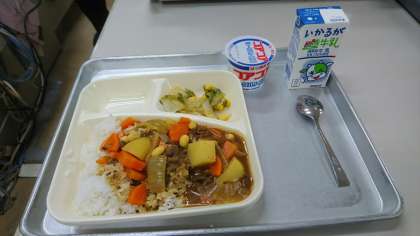 今日のカレーライスは、大豆と牛肉以外にも大きめに切られた人参やじゃがいももたっぷり入っていて、おいしいです。