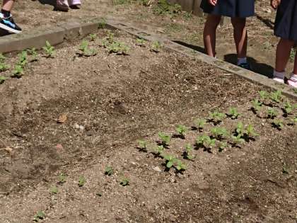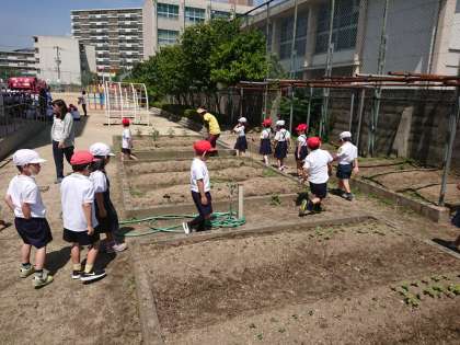 1年生が学習園で育てているヒマワリとおしろいばなの芽を観察しました。