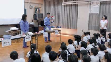 パッカー車の体験をさせていただいた後、ゲームを通してごみの分別の学習をしました。