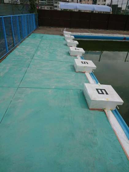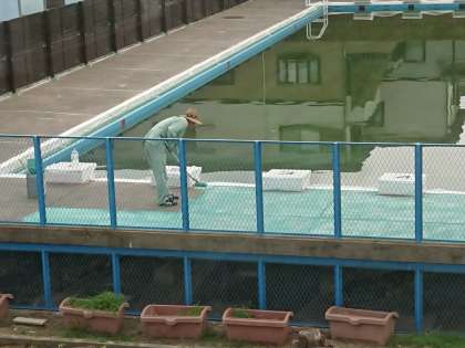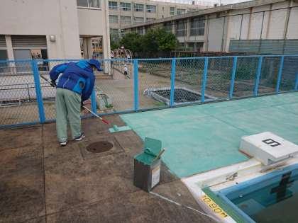 プール開きに向けて、管理作業員さんが暑さ対策のため、コンクリートに遮熱用の塗料を塗っています。