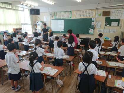 1年生の音楽では、カスタネットを使ってリズムうちをしました。