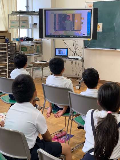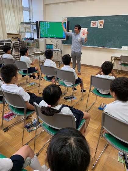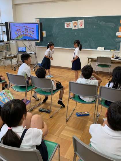 外国の国旗を見て、国の名前を英語で言ったり、ジェスチャーをしながらいろいろな国のあいさつをしたりしました。