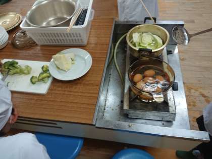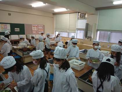 5年生の家庭科では、ゆで野菜のサラダを作りました。