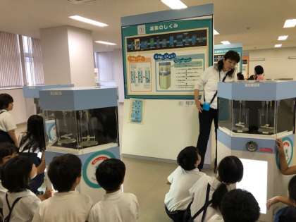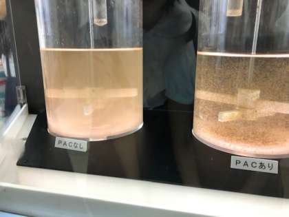 実際に浄水場で使われている薬品を使って、水の中の汚れをかためる実験を行いました。