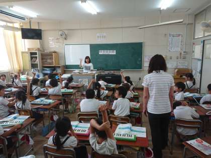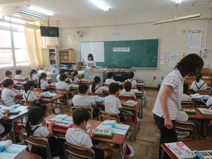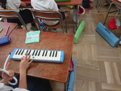 2年生の音楽では、ピアニカで「かえるのうた」を演奏しました。