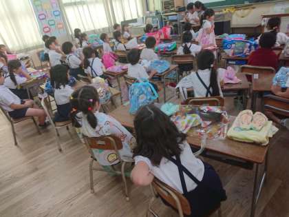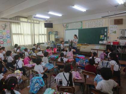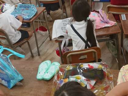 1年生は、来週から始まるプールの授業に向けて、水着の着替え方のお話がありました。