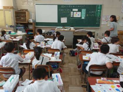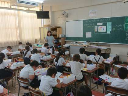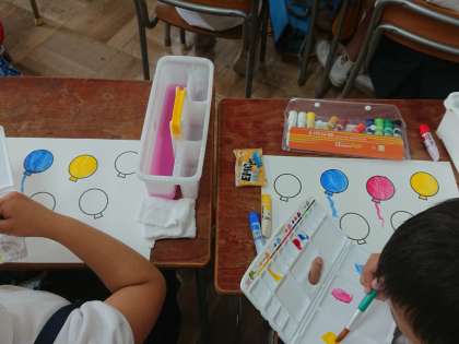 2年生の図工では、初めて絵の具を使って色を雪ぬりました。