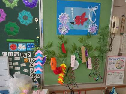 子どもたちは短冊に願いを書いて飾っています。