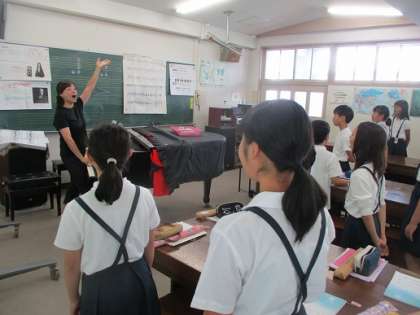 今日、6年生の音楽の授業に、横堤中学校の音楽の先生が来られました。