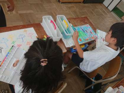 2年生の図工では、「カラフルなかさ」を描きました。