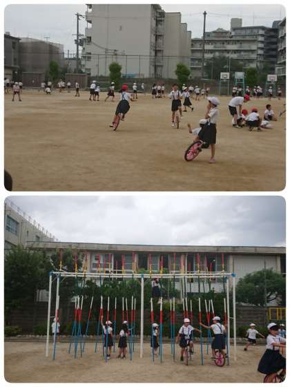 先生と一緒に鬼ごっこをしたり、一輪車に乗ったり、遊具で遊んだりしています。