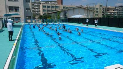 天気が良くて気温が高くなったので、「プール指導の参加者が増えるかなぁ」と期待していたのですが、先週の金曜日より少し減って、全学年で150人ほどでした。