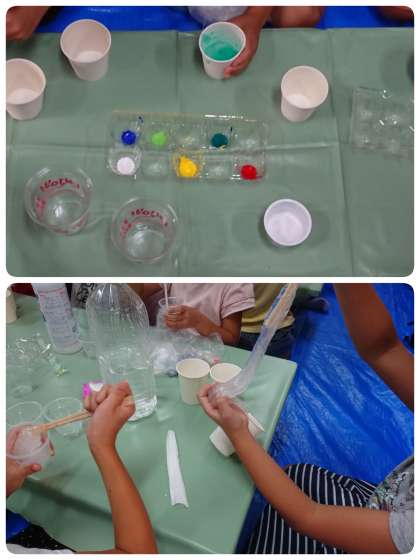 子どもたちは、作ったスライムに絵具で色をつけました。