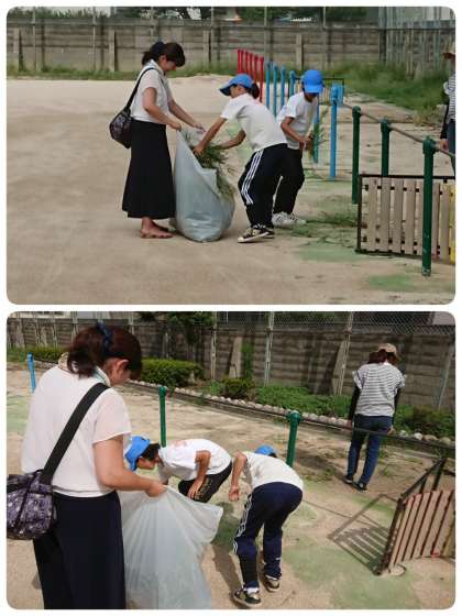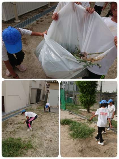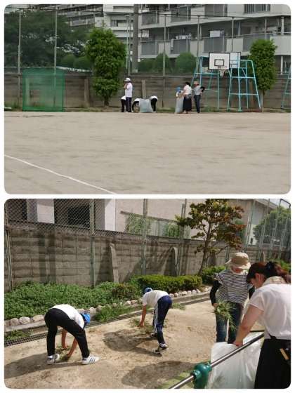 朝から地域のキックベースボールチームの子どもたち、保護者な方々が運動場に生えている雑草を抜いてくれました。