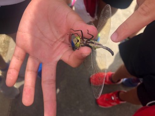 トンボやバッタを観察し、足の本数やからだのつくりを調べました。
