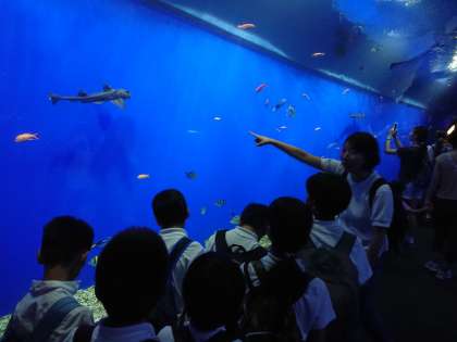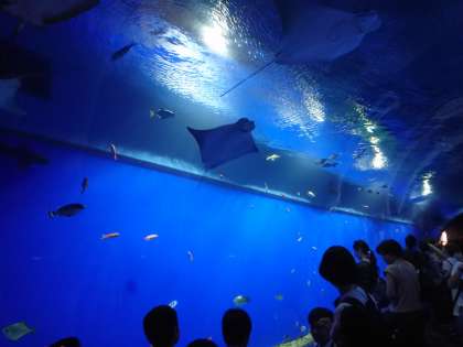 頭上をたくさんの魚が泳いでいて、まるで水中にいるようです。