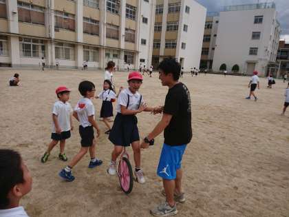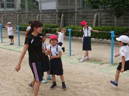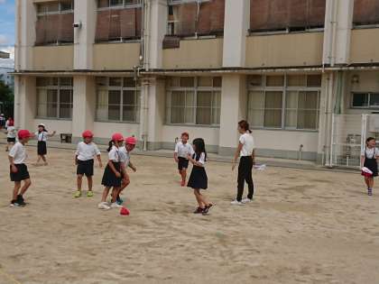 昼休みは、たくさんの先生が運動場で子どもたちと一緒に遊んでいます。