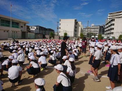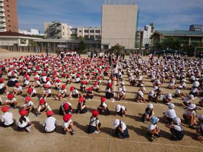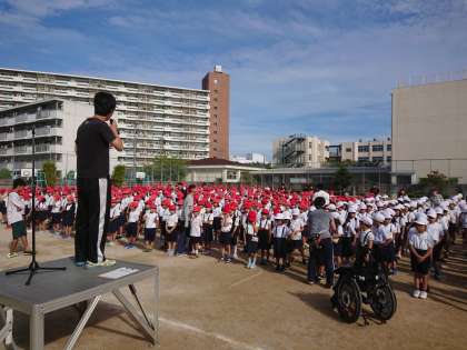 全校児童が運動場で赤白に集まって、開会式の立ち位置を確認しました。