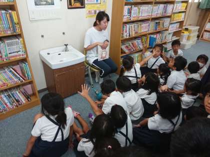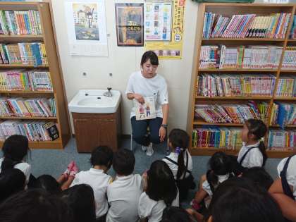 1年生の読書活動では、教育実習の先生が読み聞かせをしてくれました。