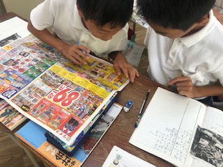 3年生の社会では、品物がどこから来ているのか、チラシで調べました。