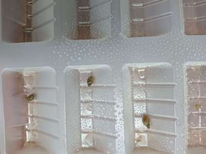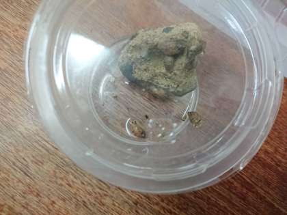 児童が学習園でカタツムリの赤ちゃんを見つけました。
