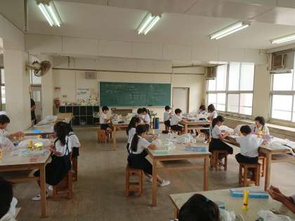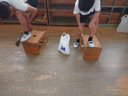 4年生の図工では、ノコギリと木工用ボンドを使って、「ギコギコ星人」を作っています。