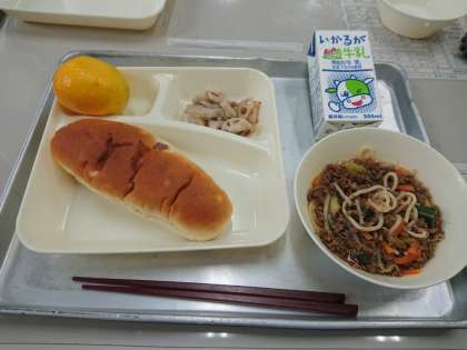 給食のタンタンめんは、チンゲンサイやもやし、にんじん、中華めんが入ったスープの上に、味つけしたひき肉をのせて食べます。