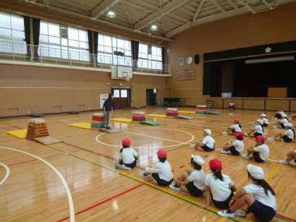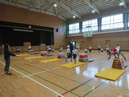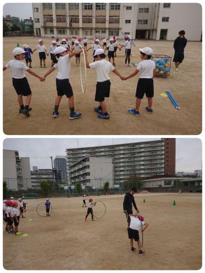 3年生の体育では、ボールやフラフープを使ってリレーをしました。