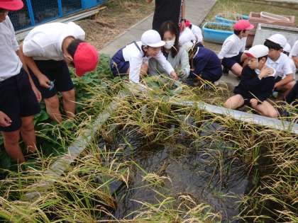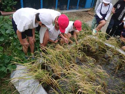 5年生は、学習園で育てた稲の刈り取りを行いました。