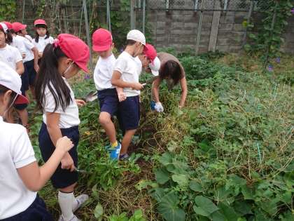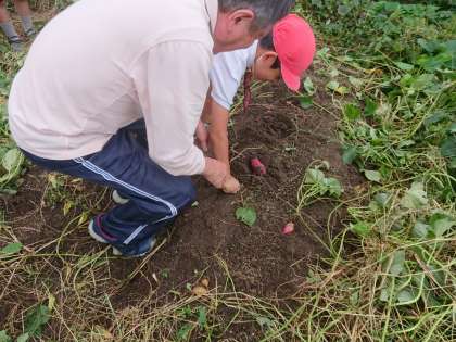 長いつるを切り取ったあと、土の中からたくさんのお芋が顔を出しました。