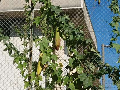 大きなヘチマは高いところにできていたので、タブレットを使って撮影しました。