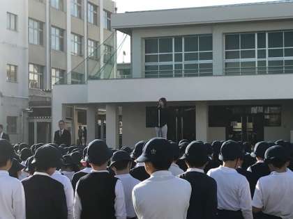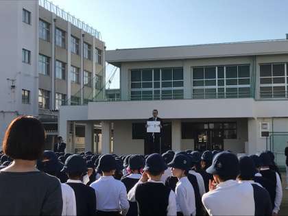 全校朝会では、校長先生から「おもいやり算」についてのお話がありました。