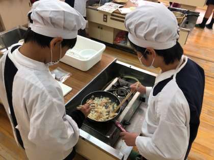 調理の手順を考え、ゆでたり、炒めたりして、調理しました。