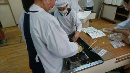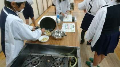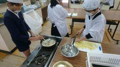 どの班も茹でたジャガイモを食べやすい大きさに切って、玉ねぎやベーコンと一緒に炒めました。