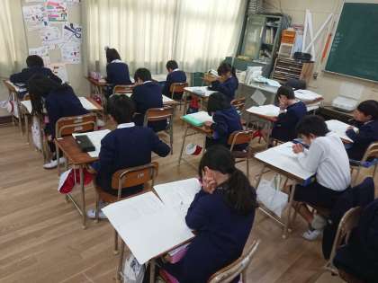 3年生では、学力経年調査に向けて、振り返りプリントを行っています。