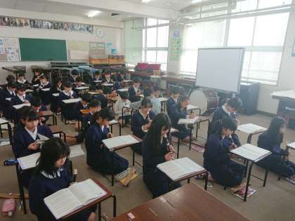6年生の音楽では、リコーダーで「ジングルベル」「きよしこの夜」「ホール・ニュー・ワールド」を練習しています。
