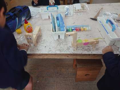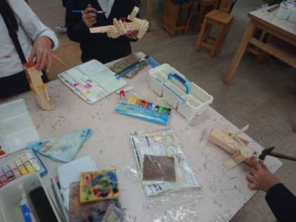 3年生の図工では、木とくぎを使って作成した作品に、色を塗っています。
