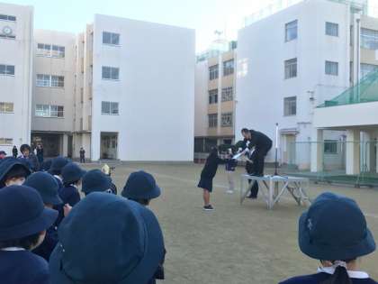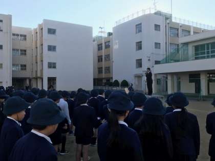 教頭先生からのお話のあと、非行防止標語(優秀賞)と防火防災図画コンクール(佳作)の表彰を行いました。
