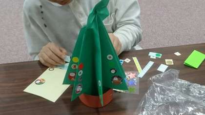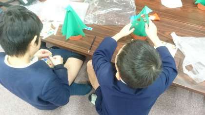 画用紙でクリスマスツリーを作って、シールなどで飾り付けをしました。