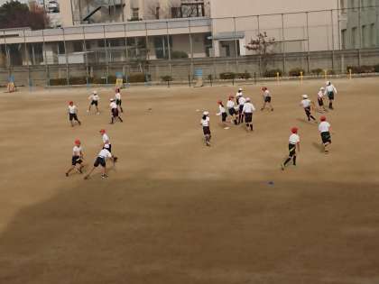 5年生は、運動場で「尻尾とり」をしています。