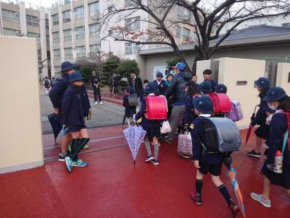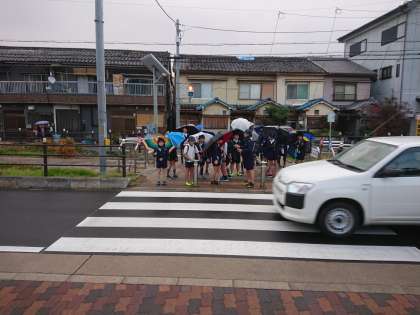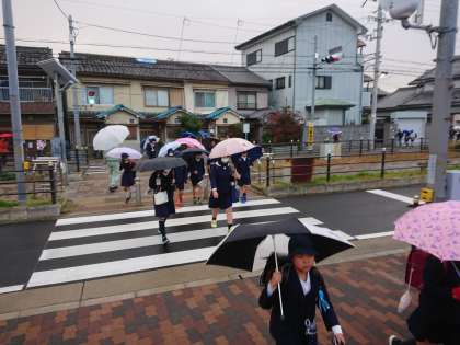 今日は小雨の中でしたが、地域のソフトボールチームの児童が朝のあいさつ運動を行ってくれました。