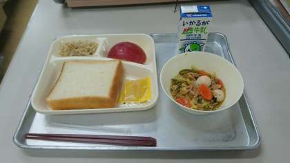 今日の給食の八宝菜には、豚肉、うずら卵、玉ねぎ、キャベツ、にんじん、たけのこ、ピーマン、しいたけの8種類の具材が入っています。