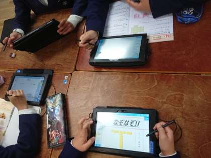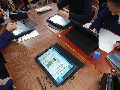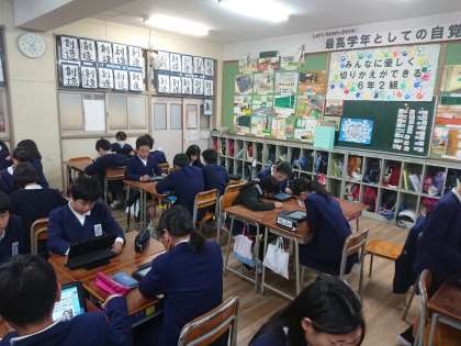 6年生は、お楽しみ会で発表するクイズをタブレットを使って作成しています。