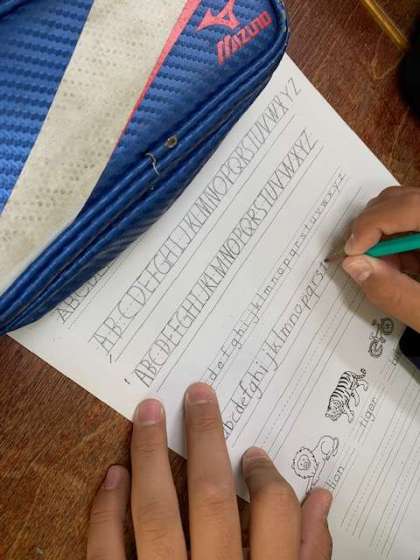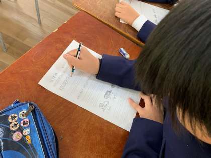 6年生の外国語活動では、中学生に向けて、アルファベットを書く練習をしています。